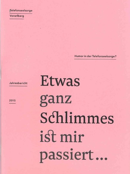 "Humor" ist das Thema des Jahresberichtes 2015. Er ist eine wichtige Kraftquelle für unsere ehrenamtliche Mitarbeiter für die Arbeit am Telefon. Einerseits für sich selber zur "Psychohygiene" und andererseits für das Gegenüber am Telefon und in der Mailberatung.
